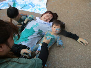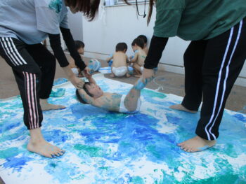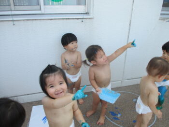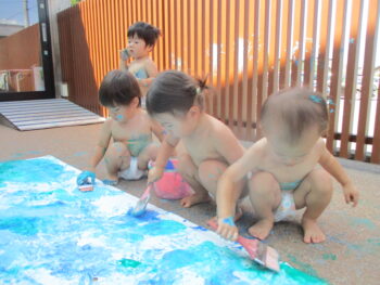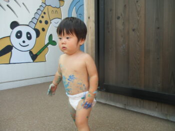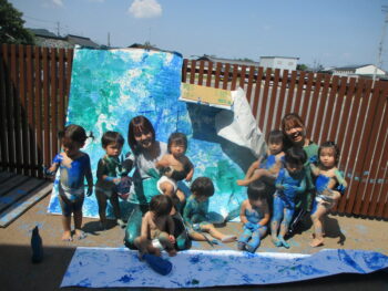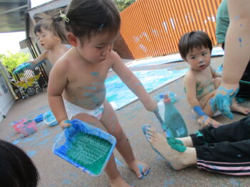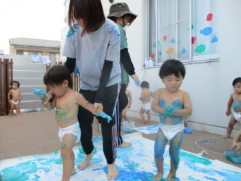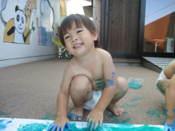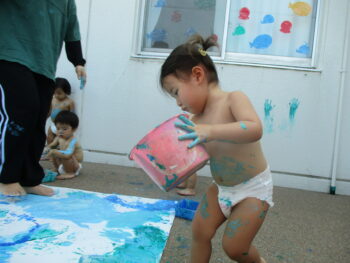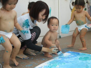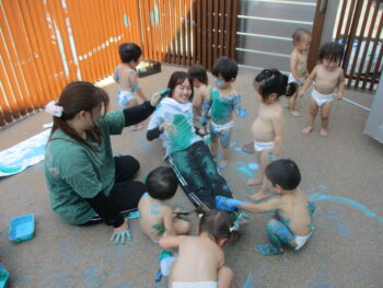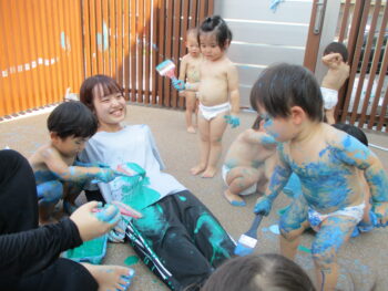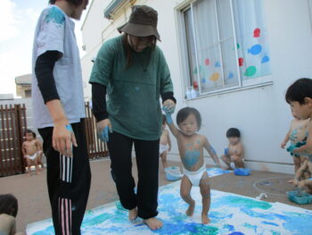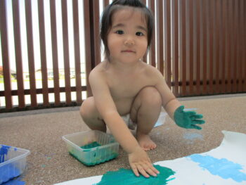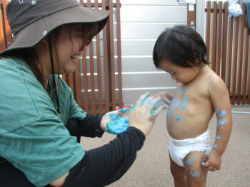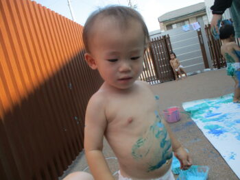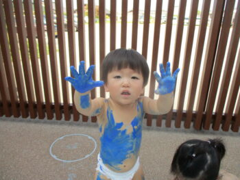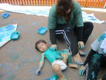 初めてボディペインティングを行いました。絵の具を紙や体に付けて、ヌルヌル~すべすべ~気持ち良さを味わっていました。