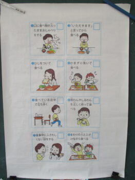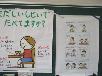 「食べながら歩くのはどうかな?」みんなは「ダメ―」と×をつくって答えています