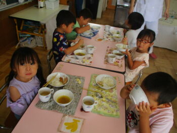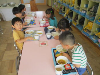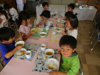 お話を聞いてお茶碗を持って姿勢に気を付けながら給食を食べました