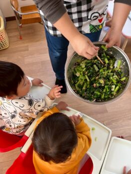 味付けをして混ぜ混ぜ~!!!ボウルの中身を必死に覗き込む子どもたち。