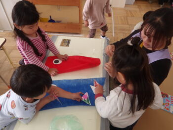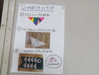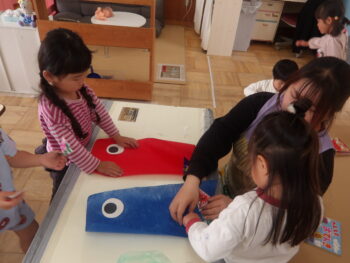 こいのぼりつくろ~(ちゅうりっぷ組) 2026年4月17日 ゆり組からスタートした活動は年少ちゅうりっぷ組にも広がり うろこ作りが始まりました できたよ~とゆり組さんに見せにいきました! テラスに飾ってあります、まだまだふえますよ~🎏